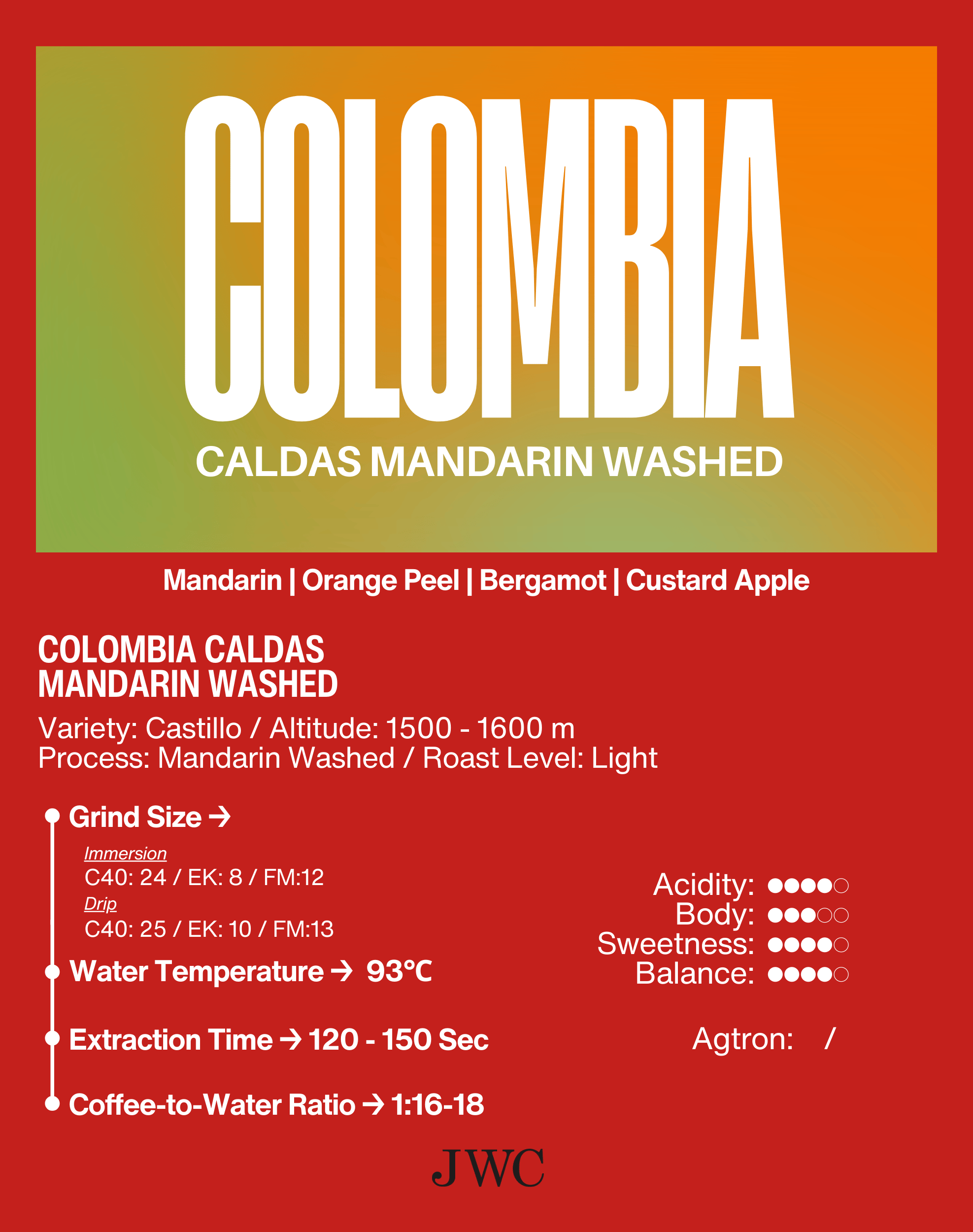 Region and Farm Introduction: Caldas is part of Colombia’s iconic Coffee Cultural Landscape, renowned for its volcanic soil, high altitude, and ideal microclimates. “Mandarin Washed” is not a standardized industry term — it is typically a micro-lot washed process tailored to enhance citrus characteristics, often involving controlled fermentation or selective contact with fruit skin to boost mandarin aromatics.