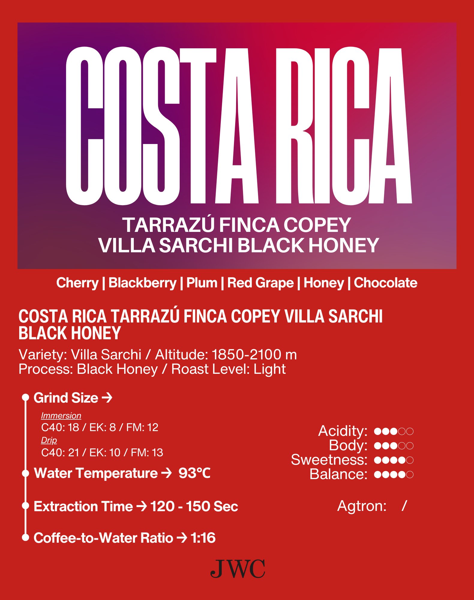 Region and Farm Introduction: Finca Copey is located in the renowned Tarrazú region, one of Costa Rica’s most celebrated coffee-producing areas, famous for its high altitude, volcanic soils, and cool climate that foster complex acidity and refined sweetness in the cup. Founded and managed by the Monge brothers, Finca Copey has specialized in producing competition-grade coffees, often placing highly in the Cup of Excellence. The Villa Sarchi variety, a natural mutation of Bourbon, thrives under Tarrazú’s unique terroir, producing elegant fruit-driven cups.
